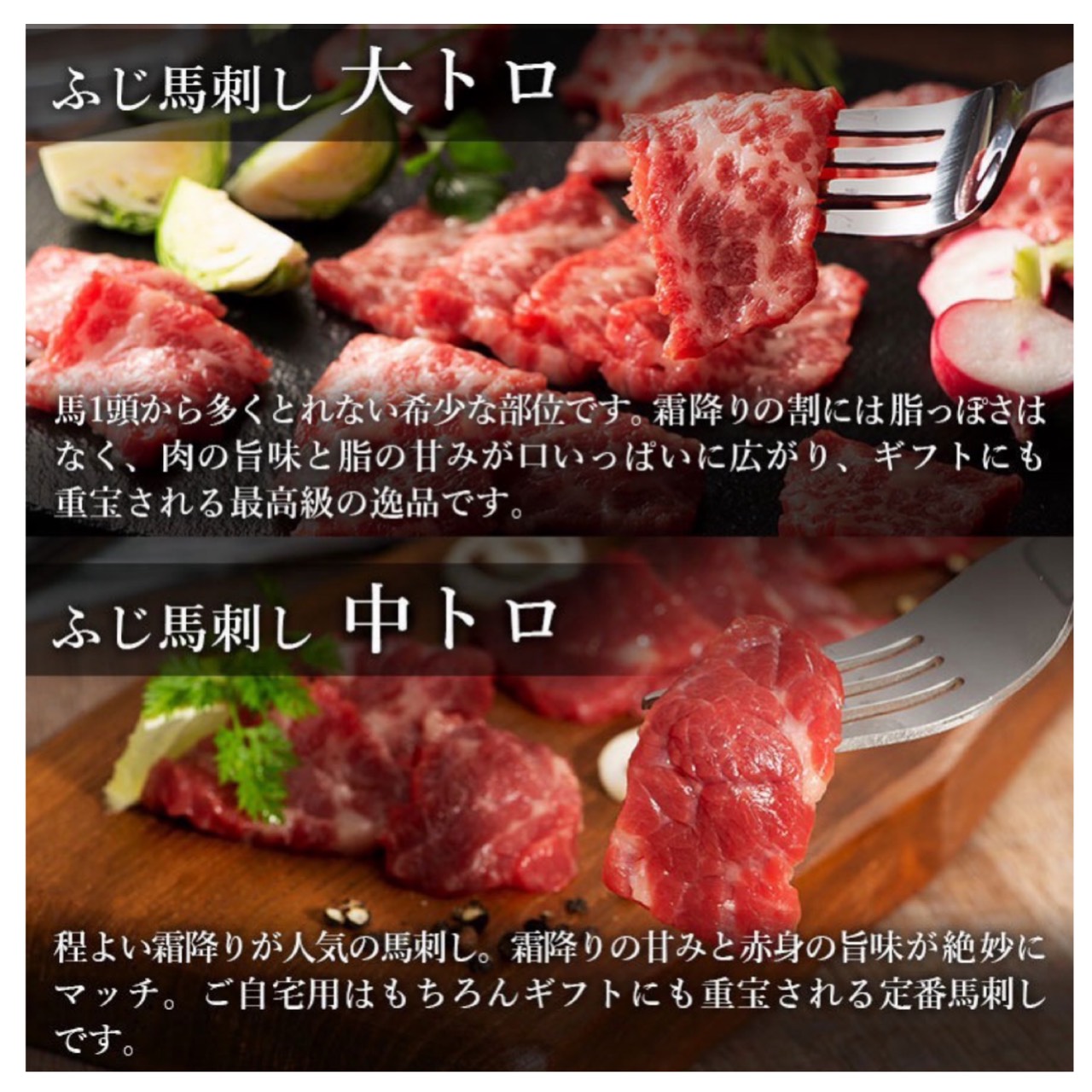 商品内容:ふじ馬刺し 上赤身・中トロ・大トロ各80g・ユッケ50g